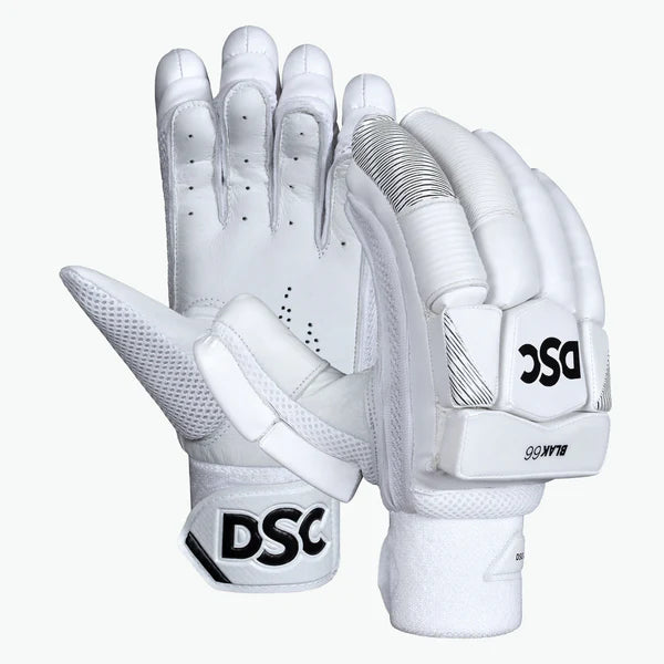 The DSC Batting Gloves Blak 66 are traditionally styled, sausage-finger gloves designed for a balance of protection and flexibility, featuring a premium leather palm, pre-curved fingers with FRP (Fibre Reinforced Protection) on the lead fingers, and an airflow gusset for ventilation. They are built for comfort and performance with a two-piece thumb, wide double-sided sweatband for moisture absorption, and ventilation in the palm to help players remain comfortable at the crease